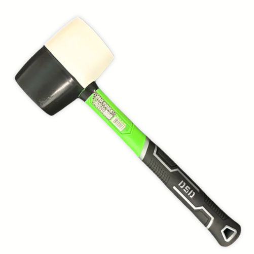 White/black rubber mallet with a fibreglass handle.