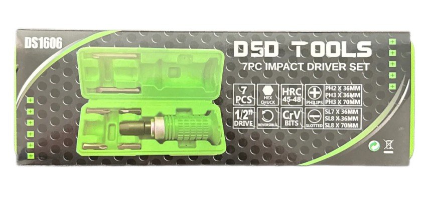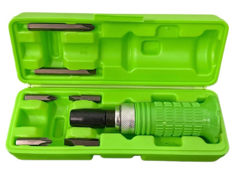 Reversible action impact driver with 1/2″ square drive and equipped with hex chuck.